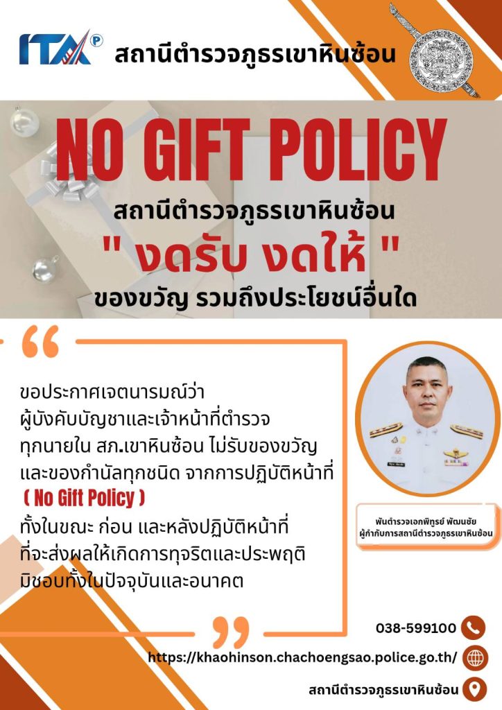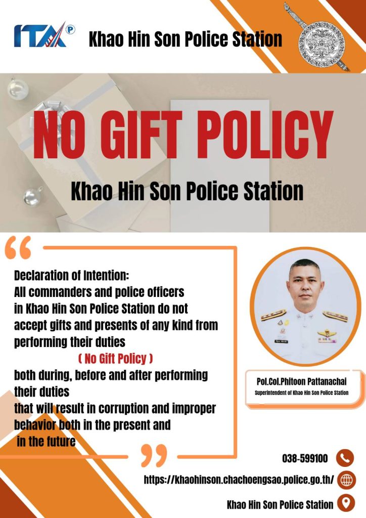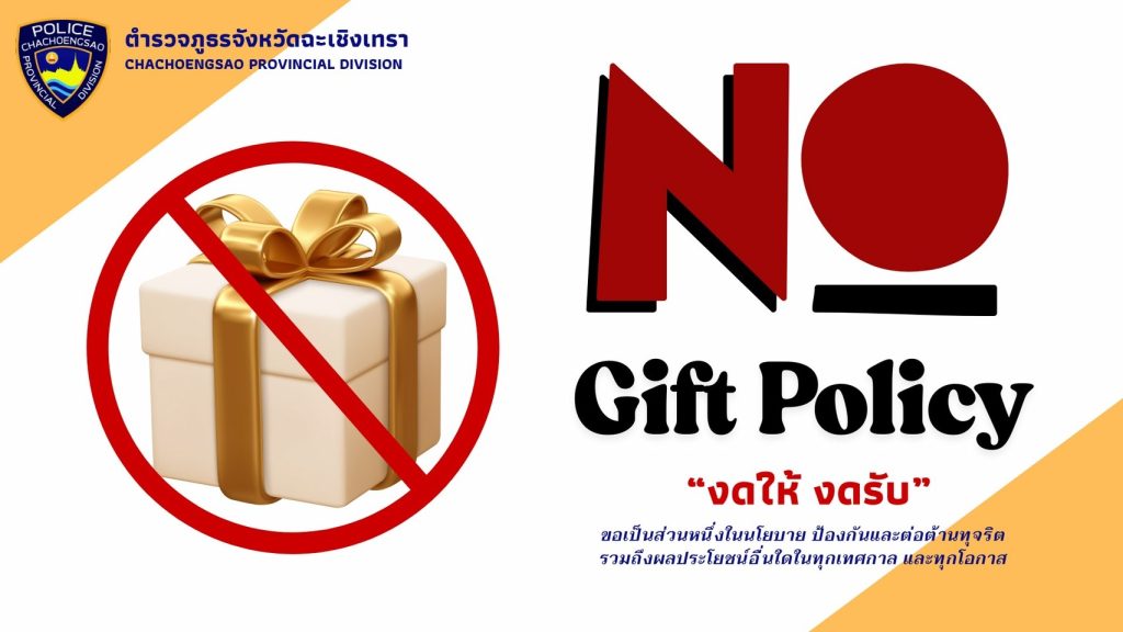 - ประกาศสำนักงานยุทธศาสตร์ตำรวจเรื่องเจตนารมณ์ที่จะไม่รับของขวัญหรือของกำนัลทุกชนิดจากการปฏิบัติหน้าที่